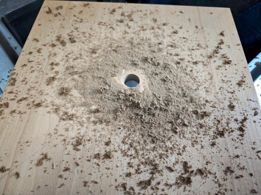 With that done, the template can be discarded and the centre hole drilled out using a spade drill.