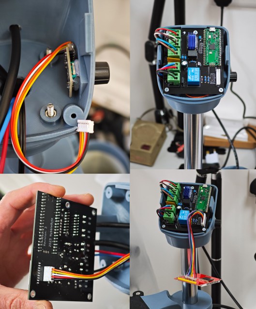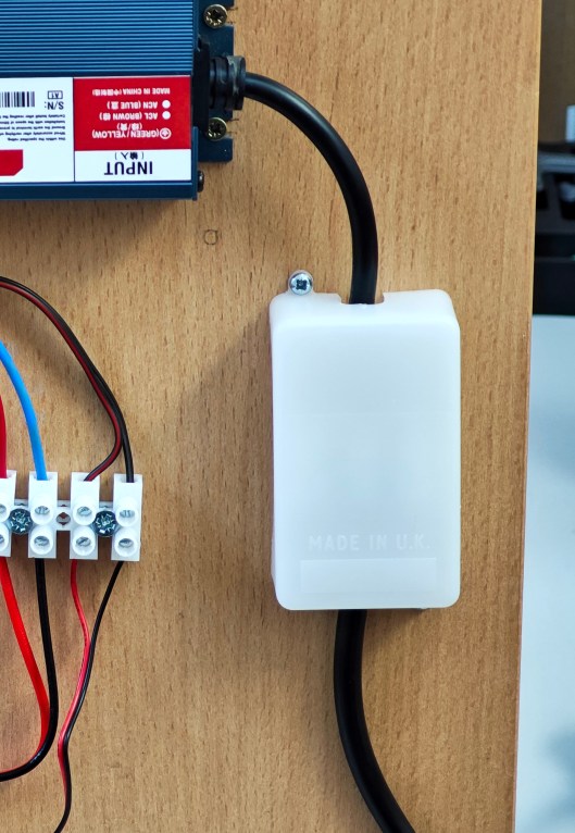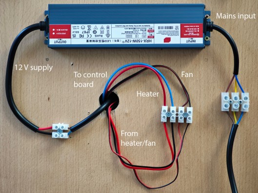 The wiring from the heater is routed through the hole in the wooden base and then connected to the extension wiring which finds its way up the 30 mm central tube to the control unit at the top. The wiring is all selected to handle more than the anticipated maximum current load. The mains input connects to the 150W 12 V power supply which is fixed to the base of the board and the 12 V output connected to a 13A-rated extension lead that feeds up the tube, also to the control board. For additional safety, I covered the connector blocks feeding the mains supply with a plastic cover.
