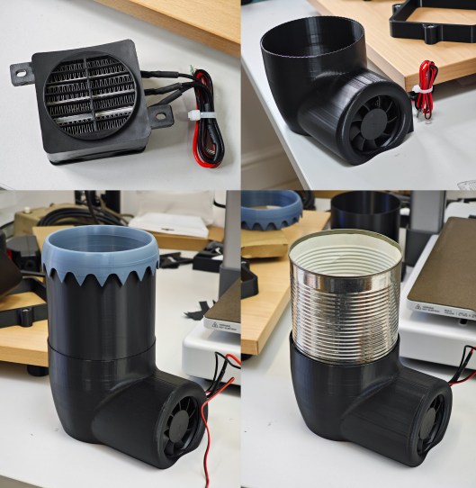 The drying chamber comprises four components: the heater complete with fan, the 3d-printed heater base, an 8 oz can, previously occupied by tomatillos, and the heater shroud top (printed). These come together more or less as shown below: