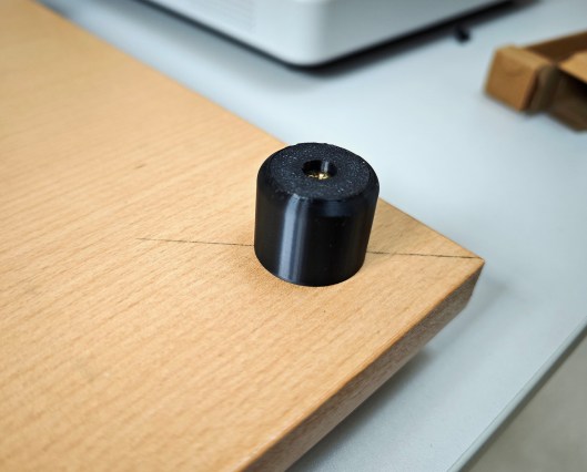 The spacers allow the nine remaining pilot holes to be drilled to accommodate the three remaining screws for each of the three jar holders. Next, four feet are printed and attached at each of the four corners on the underside.
