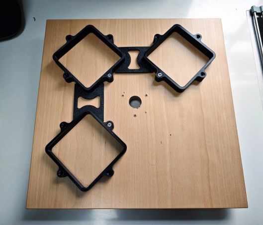 The three (now printed) jar holders are attached via one of their pilot holes and positioned with the aid of two spacers.