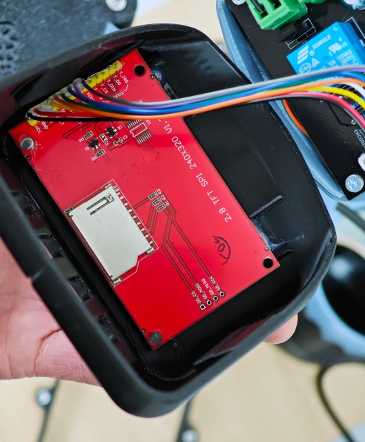The final steps all concern the wiring of the various electrical components to the Kiwiboard controller. The first of these is to fit the encoder knob into the hole in the computer housing, securing it with a squirt of hot glue. The board itself is placed loosely into position and the wires from the power supply, heater, fan and motor trimmed to length and connected to the board. Considerable care is required in connecting the motor because of the changes in wire colour between those on the motor loom, those in my chosen extension lead and the colours given in the manual! The encoder knob is connected to the rear of the board and the screen to the top.