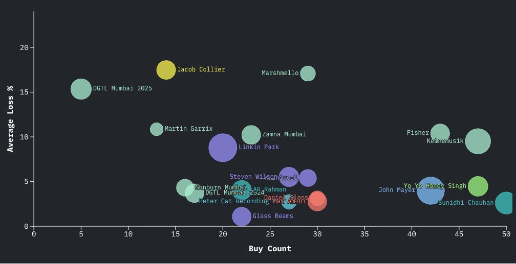 If we look beyond the boastful press releases and slick video editing from event organisers, we see an industry still finding its feet. The secondary ticket market never lies (though it may sometimes be inaccurate): every oversupply, scheduling conflict, and genuine frenzy is recorded in real rupees gained or lost.
