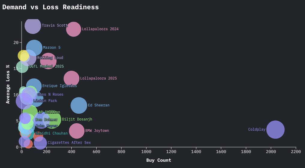 Coldplay sat at the peak of pure demand, but only a handful of artists approach that stability: Ed Sheeran and Bryan Adams through decades of repeat touring, and Diljit Dosanjh and Arijit Singh through cross-demographic and Bollywood-adjacent mass appeal. These acts convert familiarity into resale resilience. Their audiences are less speculative, more committed. Only a handful of acts can compare (eg. Taylor Swift), but for promoters, booking them reduces volatility as demand will surely follow.