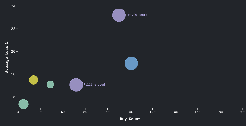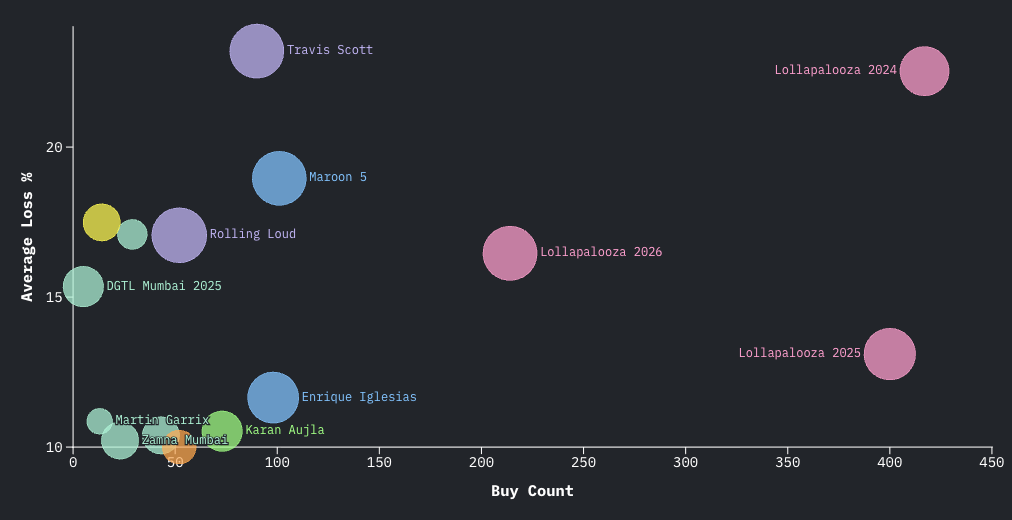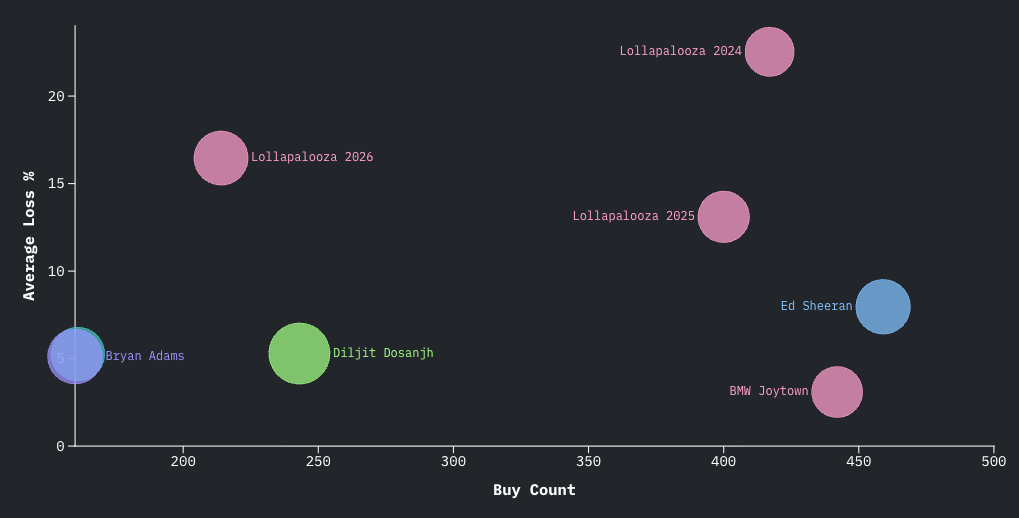 Average loss measures how far below face value sellers list tickets. Higher percentages indicate sellers absorb higher losses.