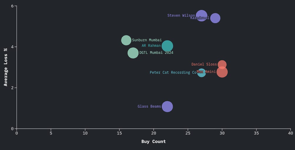 This quadrant reflects tight, self-selecting fandoms. In these niches, buyers and sellers are typically genuine fans, not speculators. For example, Steven Wilson’s cult metal following and PCRC’s reign as indie darlings ensure much lower levels of speculation and hype These communities move tickets quietly and predictably. With limited hype and little overreach, resale trends show healthy alignment between scale and audience depth.
