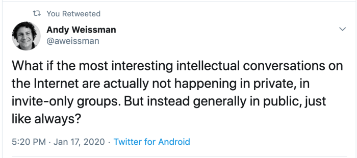 Another trend that’s a lot more explicit is the supposed rise in private group chats, where people say what they “really think”. Listen, I’m in some of these chats, and I promise you, they are not a new invention. They’re just exclusion, gossip, and pseudo-intellectual circle jerking. They are the opposite of punk. But they convey something worrisome, which is the idea that if you’re not in these invite-only chats, then you’re missing out on the real scene. (Sometimes I feel like the main point of these group chats is being able to announce, on Twitter, that you’re participating in them.) There’s nothing wrong with private conversations, but escalating social pressure to be “in” these conversations is another story.