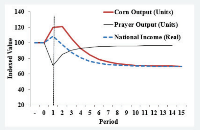 As coding becomes less profitable, high-tech workers switch back to the prayers sector. Now, both groups earn less because wages in both areas are connected by workers moving between them. This is where the OLG structure matters: when workers make less, they save less. Since their savings fund the economy’s capital, less saving leads to less investment and a smaller capital stock.