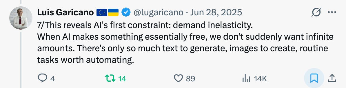 To see the intuition, consider the history of artificial lighting, which Garicano uses to motivate his post. In 1800, lighting a home cost a day’s wage. By the 1990s, the real price had fallen by a factor of 40,000. Did we consume 40,000 times more light? Of course not; our demand for light is finite. At some point, every room is bright enough, and extra lumens have near-zero value. The lighting sector’s technological triumph made it economically tiny as a share of GDP.