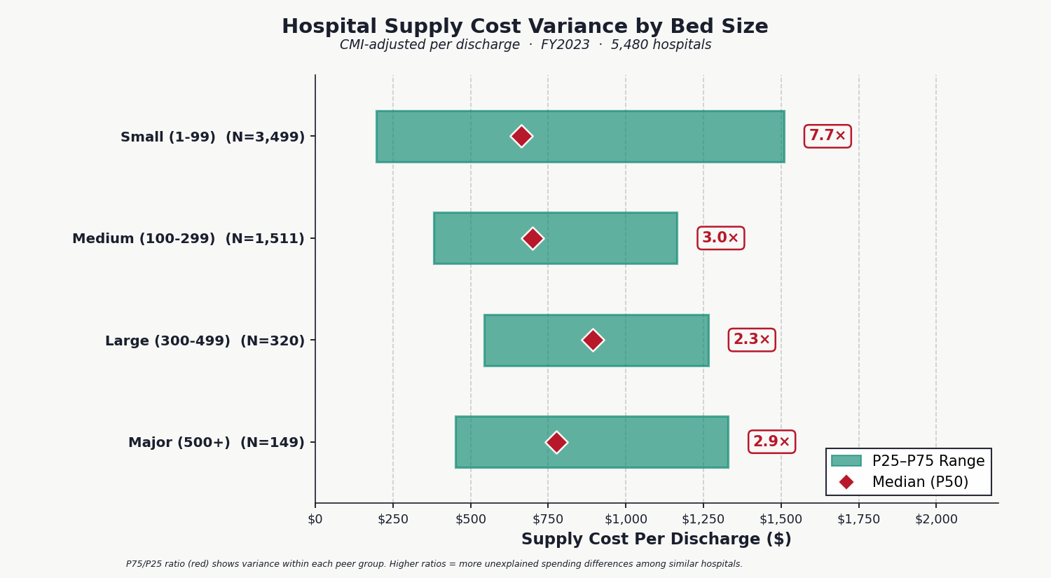 We adjusted every hospital's per-discharge supply cost for case-mix index (so a trauma center treating complex cases isn't penalized for higher supply use) and stratified by bed size (so community hospitals are compared to community hospitals, not academic medical centers). The result: two medium-sized hospitals treating patients of similar complexity spend $382 versus $1,165 per discharge, a 3.0x difference at the 25th and 75th percentiles. For small hospitals under 100 beds, the gap widens to 7.7x.