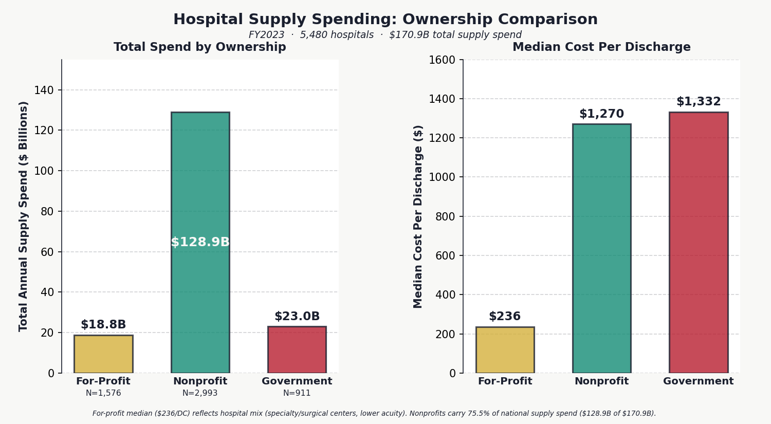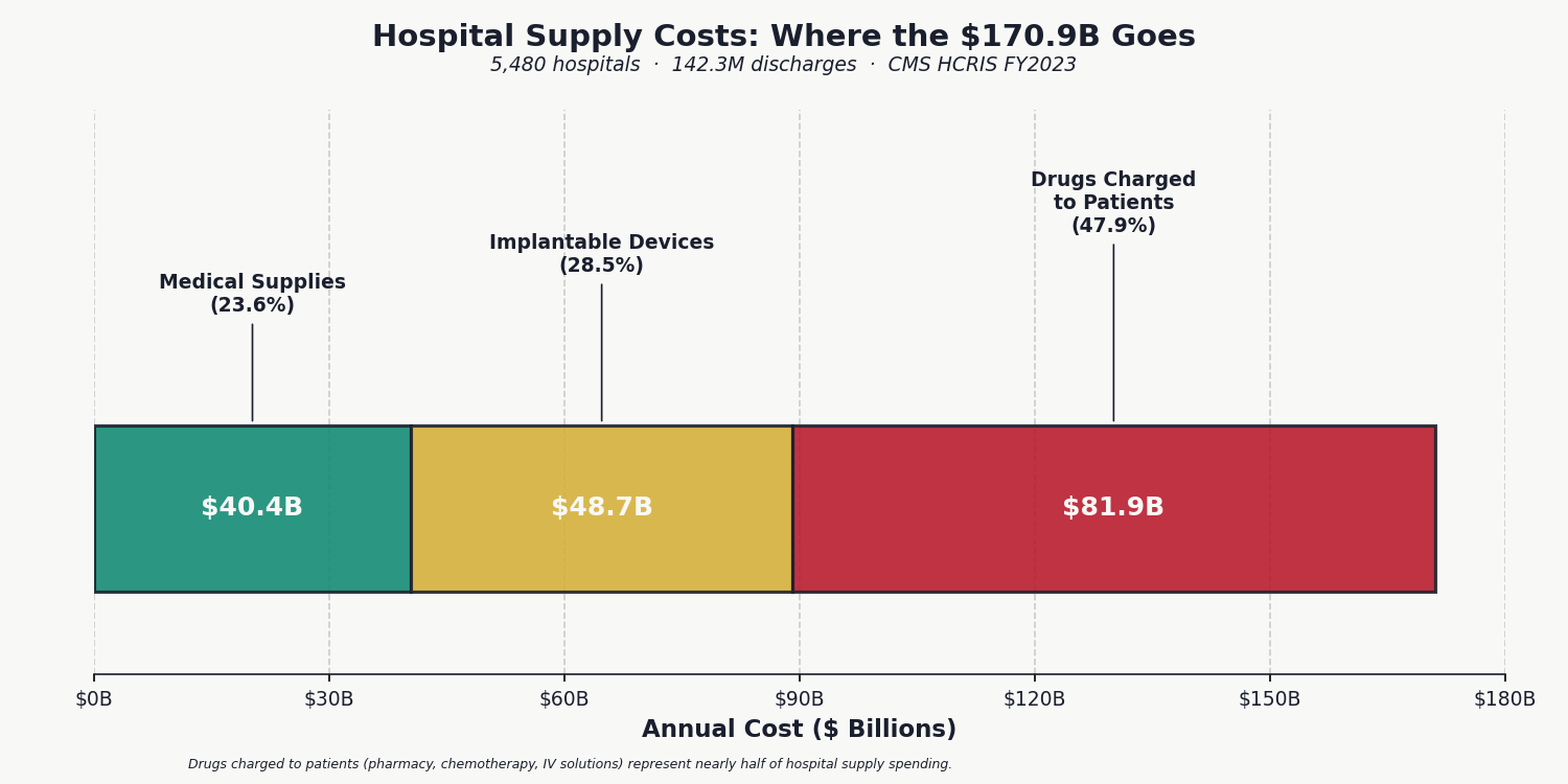 The national total: $170.9 billion, split across medical supplies ($40.4 billion), implantable devices ($48.7 billion), and drugs charged directly to patients ($81.9 billion). The national average is $1,941 per discharge. But the average conceals the real finding: massive, unexplained variance.