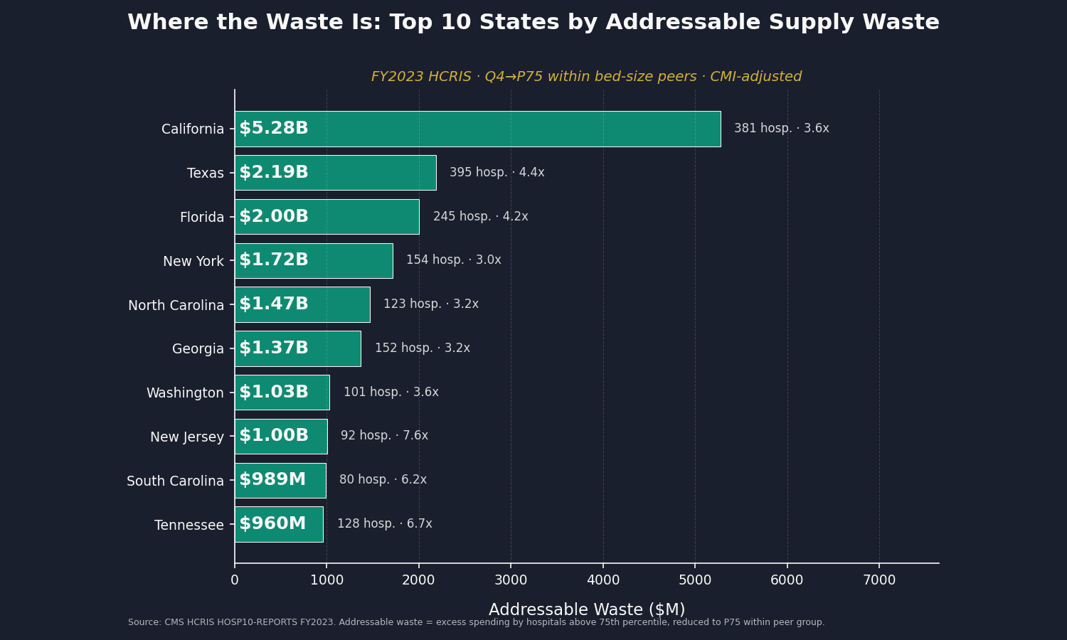 No published source ranks states by hospital supply cost variance. We computed one. California's hospitals account for $5.3 billion of the $28 billion in addressable waste, followed by Texas ($2.2 billion), Florida ($2.0 billion), and New York ($1.7 billion). The widest per-discharge variance is in Louisiana (20.6x between the 25th and 75th percentile hospitals) and Arizona (14.0x), suggesting acute procurement inefficiency in those states.