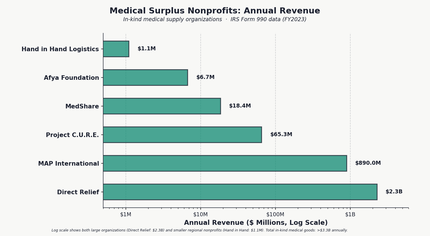 Medical surplus nonprofits process over $3.3 billion per year in hospital supply donations. We built a second original dataset by parsing IRS e-filed Form 990 XML bulk downloads and extracting Schedule M data (Line 20: Drugs & Medical Supplies) for every nonprofit in the country. No published source aggregates this data nationally. In just four months of filings, we identified 620 organizations receiving $1.4 billion in donated medical supplies. Extrapolating to a full year and including Direct Relief's $2.14 billion pharmaceutical channel, the total is in the range of $3.5 to $5 billion annually.