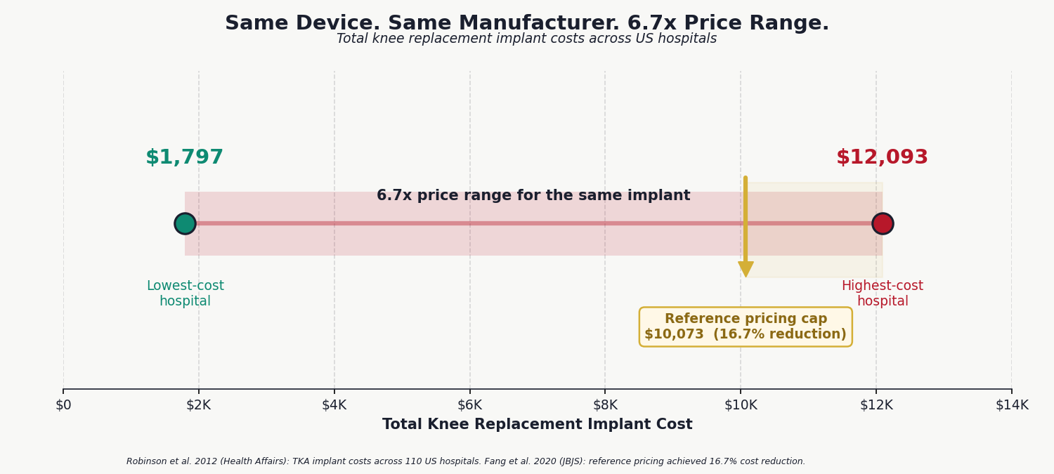 Implant pricing creates an additional layer of waste. The same total knee replacement implant costs $1,797 at one hospital and $12,093 at another. That is a 6.7× price variance for an identical device from an identical manufacturer. Hospitals with reference pricing programs for implants achieve 16.7 percent cost reductions.