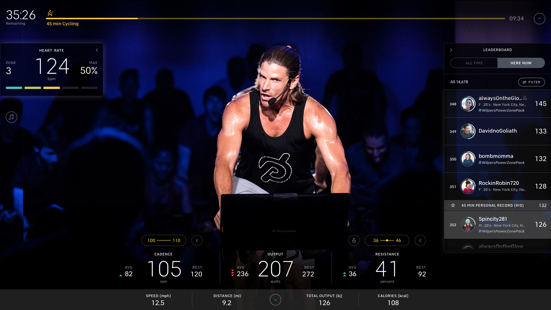 This is psychologically fucked up, I realize, but it is my reality. In my early days of Peloton, I loved doing live rides — where you compete in real-time — or, in on-demand rides, keeping the “full” leaderboard up. I found it thrilling to watch my placement on the board (determined by “output,” which is itself determined by the resistance and cadence on the bike) go up by, oh, 1000 in a single minute. My favorite rides were Alex’s Club Bangers and Robin’s HIIT & Hills.
