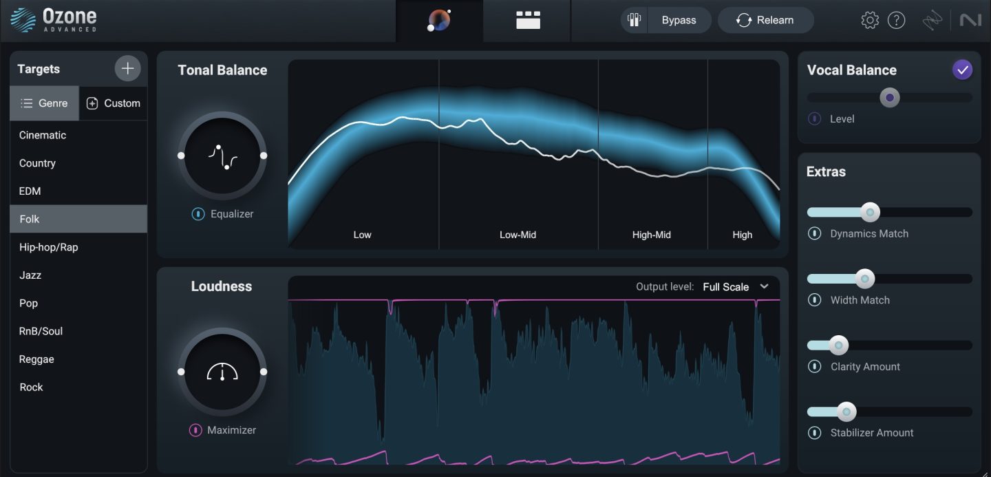 Ozone works a bit differently from many other services, which offer tonal options like “warm” or “vintage.” Instead, Ozone is based around genres. It will try to infer yours from listening to your track, but you can change it with a single click. Each genre comes with a different overall EQ curve, and Ozone attempts to match your music to the selected curve (a process you can watch play out in real time on the main Ozone screen). Ozone categorized my test track for this article as “rock,” but I found that the slightly lower mid-to-high end of the “folk” genre suited my preferences better.