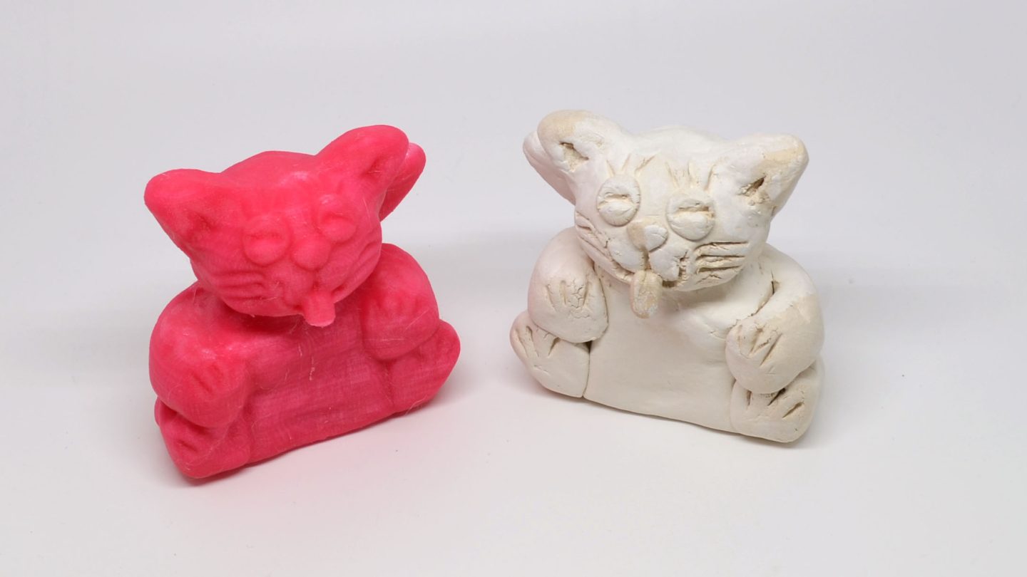 The final model (left) printed in PLA on the MOD-t. The Matter and Form 3D Scanner produced the closest reproduction of the original clay cat model (right) out of any of the solutions in this roundup.