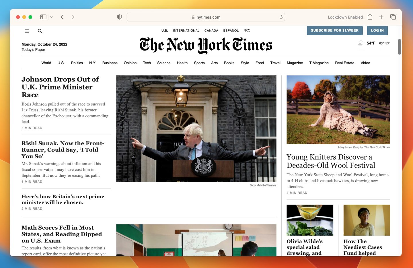 The other big hole in Lockdown Mode on the Mac is that its limitations on Internet content only apply in Safari, not in other browsers. In Safari with Lockdown Mode enabled, the fonts on The New York Times homepage don’t render correctly, presumably because they’re being loaded using something that Lockdown Mode blocks. In Chrome, they render just fine. Apple can’t force third-party apps to change their behavior in Lockdown Mode, and as best I can tell, there’s no public API allowing them to do so even if they wanted to. Just something to be aware of if you think you might benefit from the extra protections.