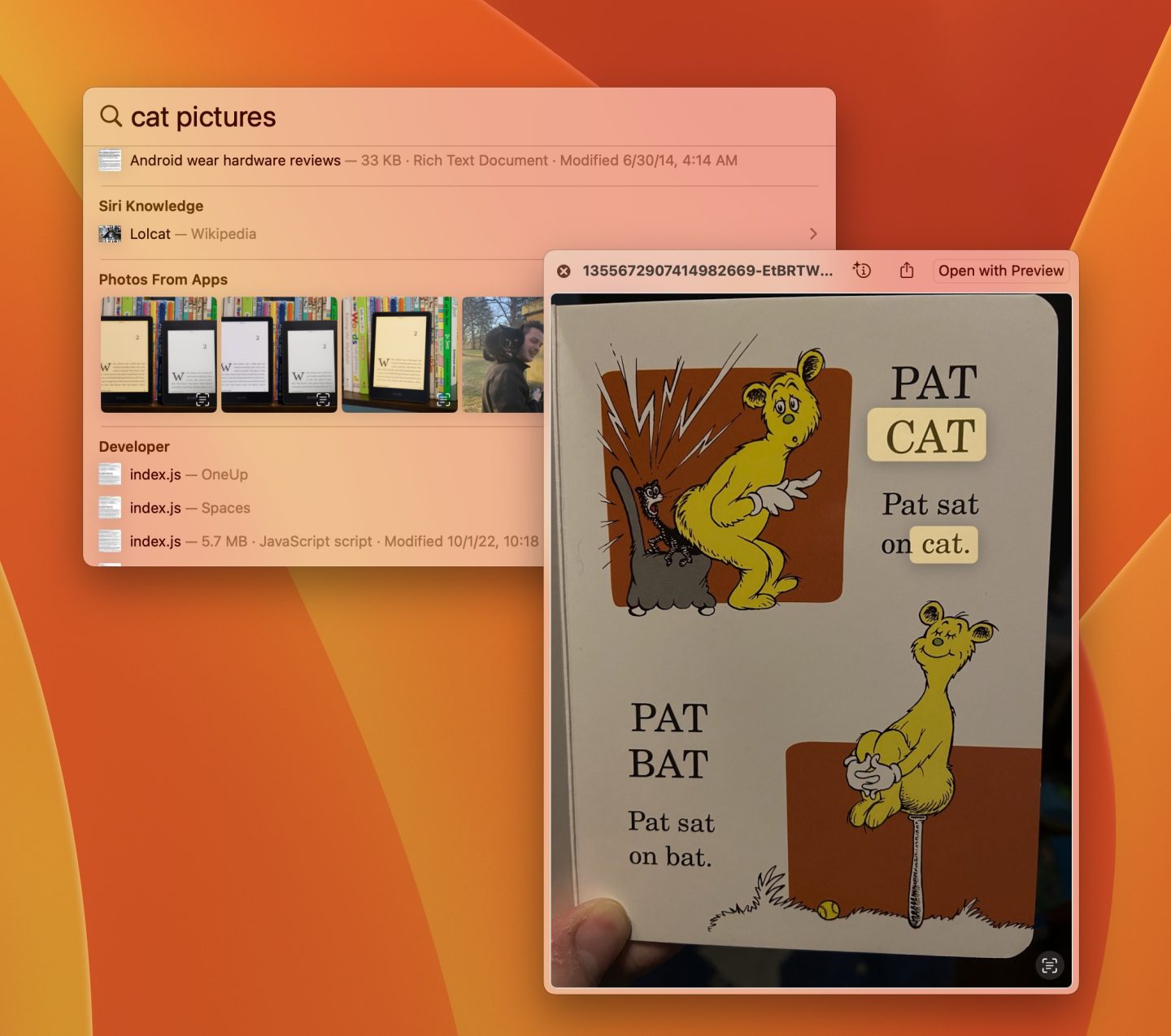 Spotlight can search through images on the Internet and on your Mac. It will try to match generic subjects (“car” or “cat”) and will also leverage Live Text to look through images with text in them (Pat is a freak). Credit: Andrew Cunningham