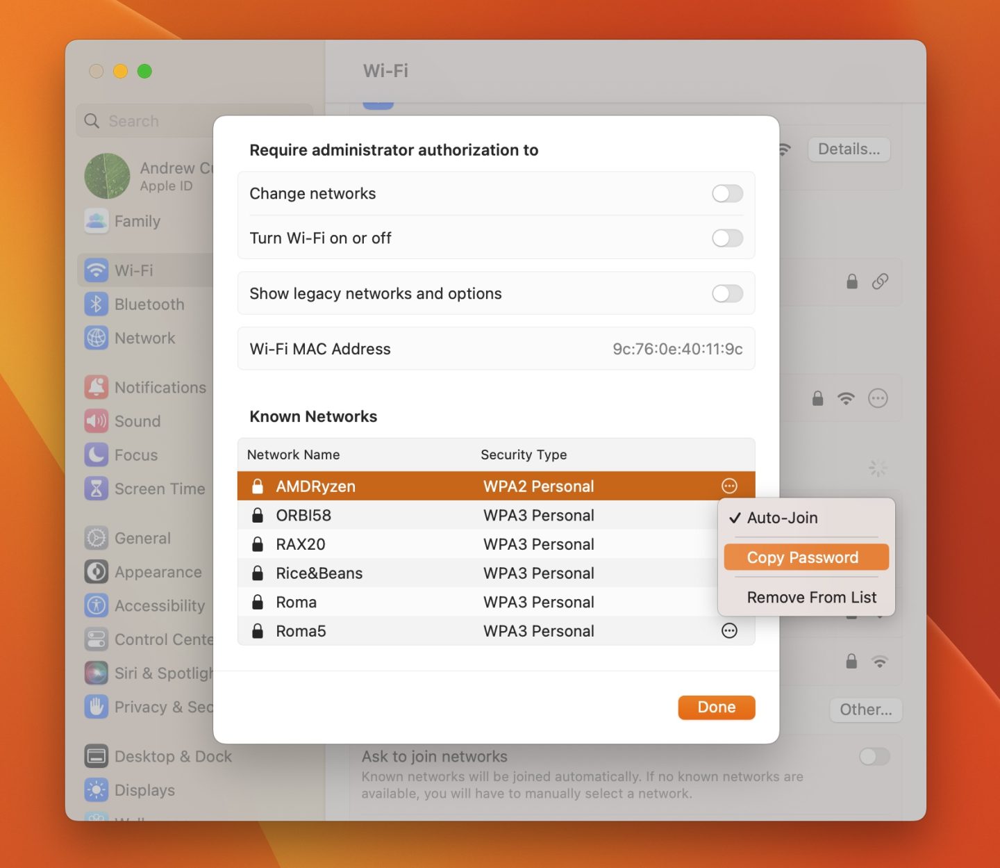 In the Wi-Fi settings, if you click the Advanced button, you’ll see a list of every Wi-Fi network you’ve ever connected to. Ventura will let you copy the passwords for each of those networks so you can more easily view and share them, which is useful if the automated Wi-Fi password-sharing features aren’t working properly for some other reason. (Also, maybe prune your list of Wi-Fi networks while you’re here?)