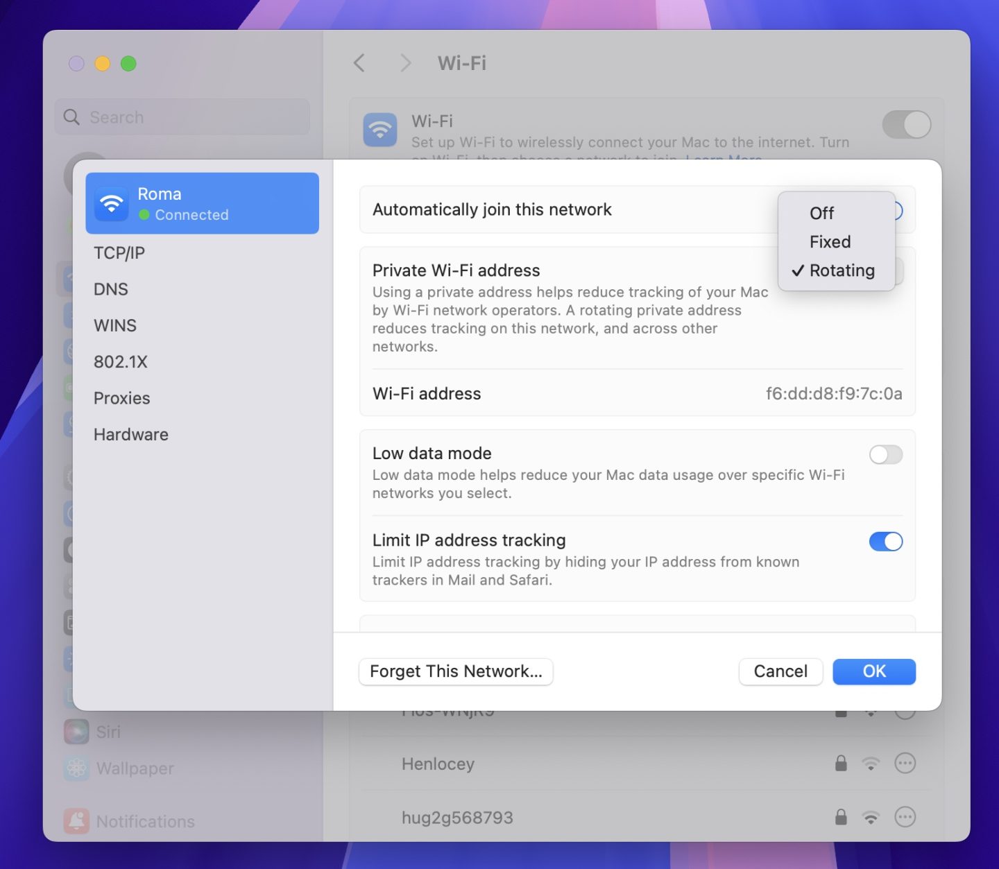 The private MAC address feature from iOS is coming to macOS—”Fixed” assigns one MAC address to every network you connect to, while “Rotating” keeps changing the MAC address periodically.