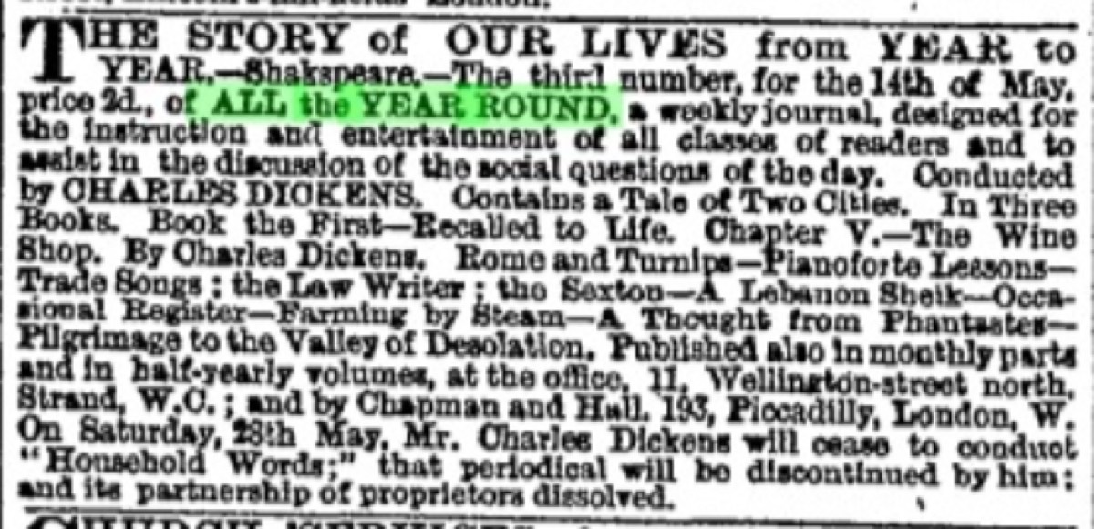 This advertisement for the third number of All the Year Round was published in The Times, at Dickens’ request, on May 11, 1859. Credit: Dickens Code Project/Public domain