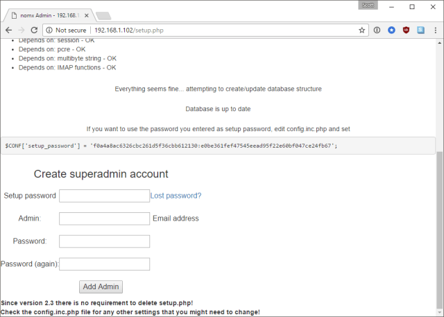 Further down the setup page we can create our own ‘superadmin’ account and all we need is the setup password.