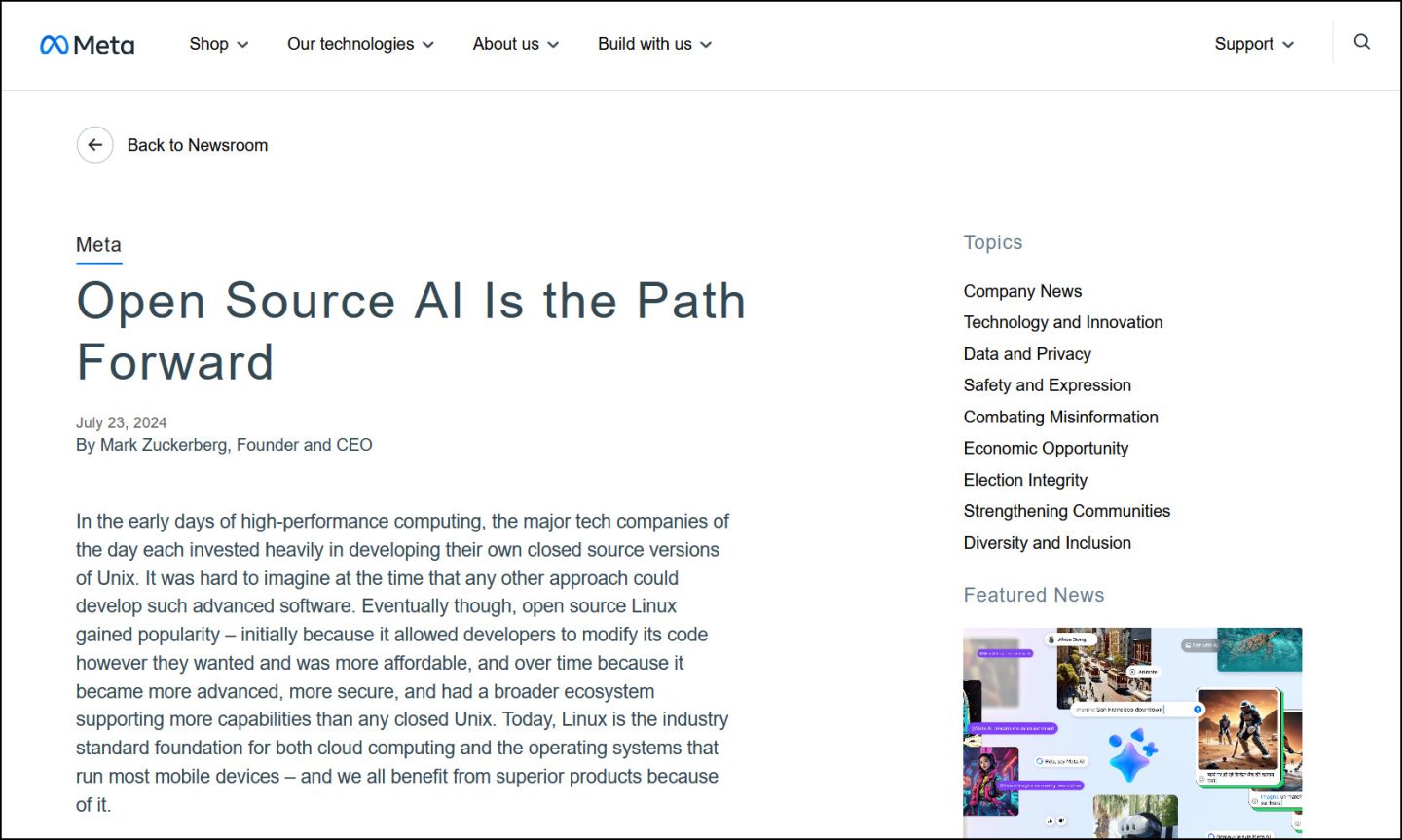A screenshot of Mark Zuckerberg’s essay, “Open Source AI Is the Path Forward,” published on July 23, 2024. Credit: Benj Edwards / Meta
