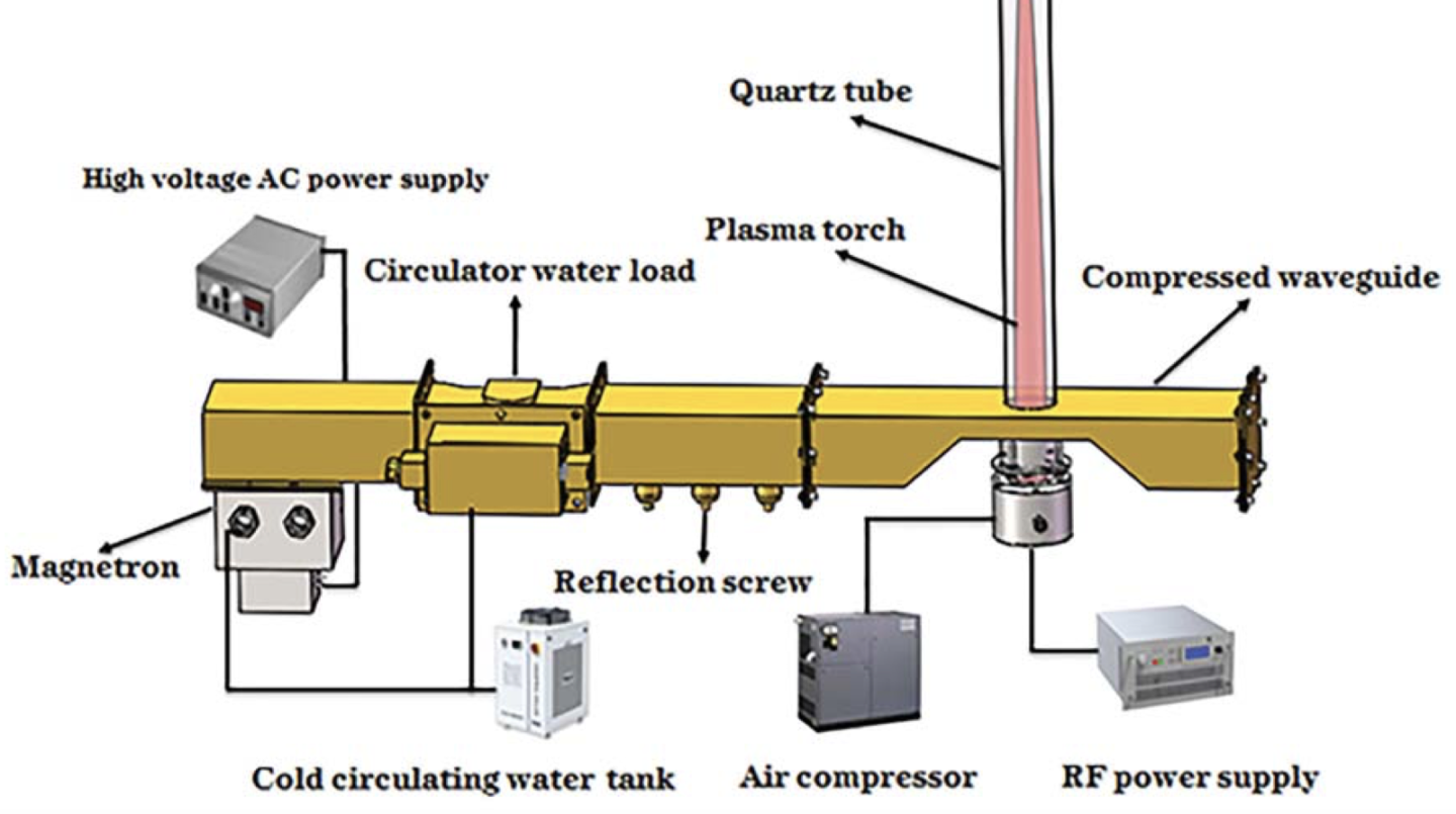 To do this, the researchers used a magnetron to generate relatively high-powered microwaves (about 1kW). The microwaves travel down a waveguide (a rectangular metal tube) that gets progressively thinner and then expands again (see picture). A quartz tube is placed in a hole in the waveguide at the narrowest point. Air is forced through the quartz tube, passes through a small section of waveguide, and then exits the other end of the quartz tube.