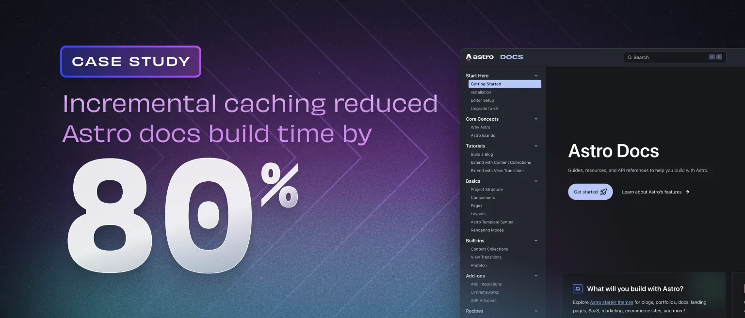 Enabling content caching on the real-world Astro Docs codebase saw the relevant step in astro build drop from 133.20s to 10.46s, about 92% faster. The end-to-end build time was reduced from 4mins 58s to just over 60s, for a total build time that was 80% faster. We’ve seen similarly impressive results reported in other real-world scenarios.