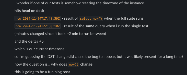 At first, I thought an unrelated change in the datastore might be the cause, but then our team started to notice this failure on other changes, including when we reran code merged on main last week; this was especially odd because our merge process runs the full test suite before merging… and the test was now consistently failing on all runs!