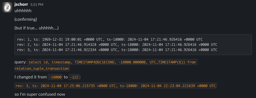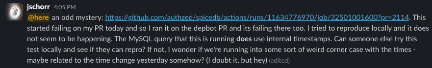 This led me to believe that something was broken in the test or the MySQL datastore implementation itself… Yet no one in the SpiceDB project had made any changes related to the datastores in SpiceDB since Friday… and the test failure was consistent.