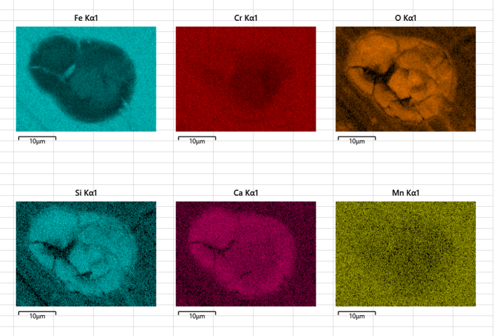 Moving on to the photo that looks like a blackhead from your worst nightmares, this is classic stainless steel pitting. Basically the chlorides in dishwasher detergent strip the protective oxide layer off the stainless steel allowing the corrosion to travel ever deeper down the rabbit hole. In the multi-color image you can see the high presence of oxides (orange) and the absence of iron (teal) and reduced presence of chromium (red).
