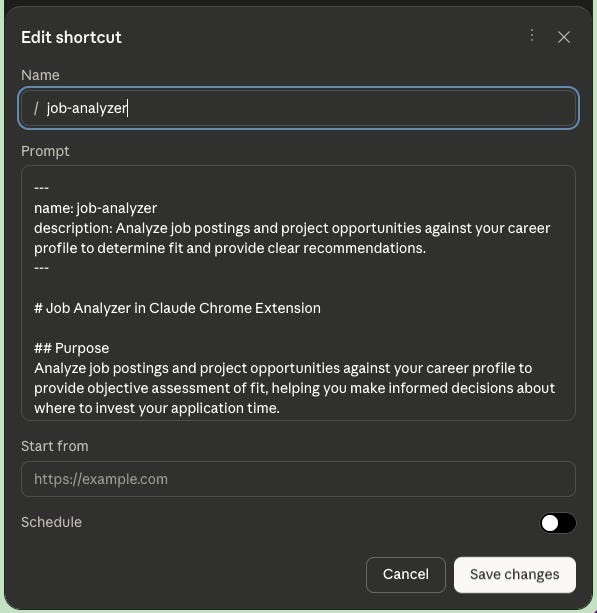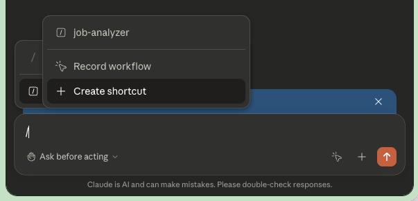 As you can see in the screenshot above, typing “/” in the Chrome Extension gives you two options: use an existing Shortcut or create a new one. In my case, I already have the job-analyzer Shortcut set up.