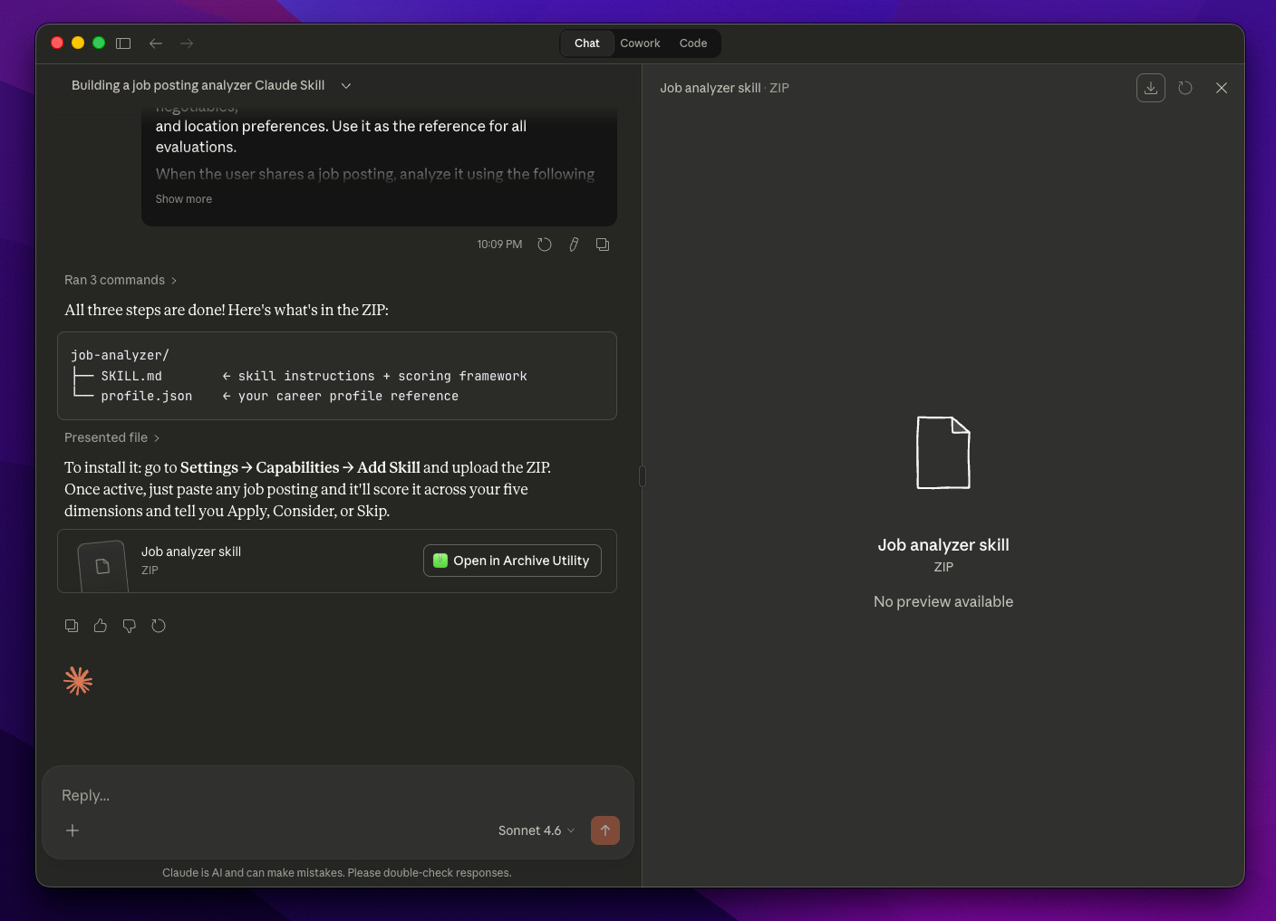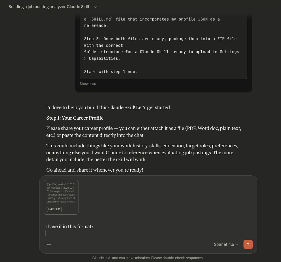 Once your Skill is active, you’ll need to copy the job posting text and paste it into Claude for the Skill to analyze it. Not very practical if you’re going through dozens of listings.