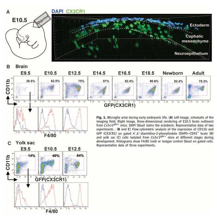 This work in the 2000s and early 2010s was a major breakthrough in the microglia field. These elegant experiments showed that microglia self-renew and do not depend on circulating cells. Microglia actually arise from macrophage progenitors that settle into the early brain during embryonic development (i.e. showing the power of fate mapping) - https://pubmed.ncbi.nlm.nih.gov/20966214/ On a side note, there are countless opportunities to build fate mapping platforms for everything from HSCs to neurons/microglia.