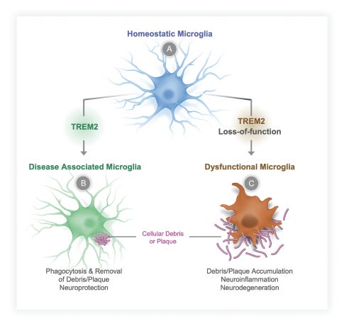Vigil’s focus on TREM2 comes from their overall approach of linking microglia to rare-and-common CNS diseases. Everything from AD to leukoencephalopathies and leukodystrophies, ALS, epilepsies, and more. Genomics has shown genetic mutations affecting microglia function are connected to neuronal function and neurodegeneration. This makes sense at a biological level where microglia are essential to maintain CNS homeostasis. In their normal state, microglia monitor for damage from infections to myelin (i.e. axon insulation) damage. In a disease-associated state (DAM), they move towards phagocytosis of cellular debris (would be plaques in AD) to axon pruning. Vigil’s hypothesis is that DAM has neuroprotective functions so the company’s 2 lead assets are centered around pushing microglia to a DAM state.