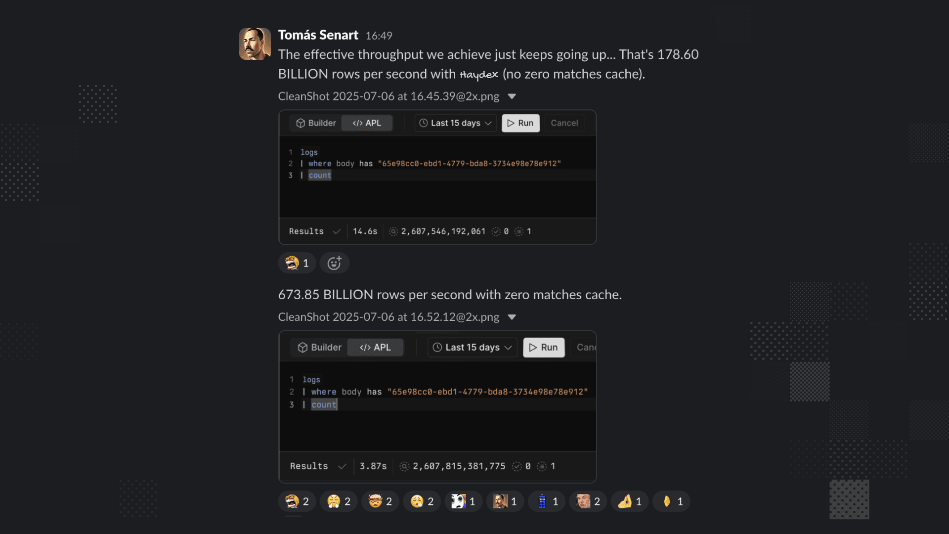 On July 6th, I ran a query with Haydex enabled but with our zero-matches cache (a separate, existing sub-system) turned off. The result popped up on my screen: an effective throughput of 178,600,000,000 rows per second. Then, for the grand finale, we re-enabled the zero-matches cache on the already-pruned results. The synergy was incredible. The two systems, working in concert, peaked at an effective throughput of 673,850,000,000 rows per second.