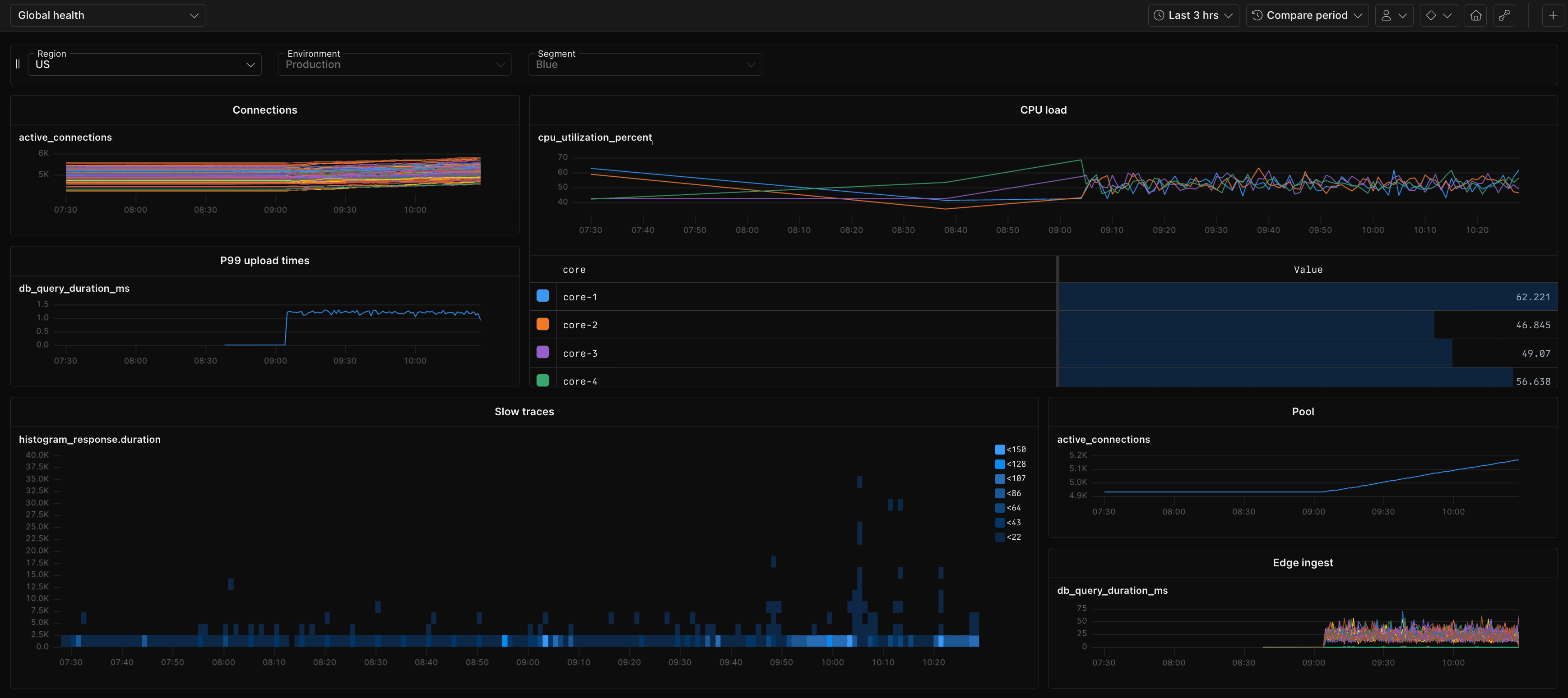 - Combine logs, traces, and metrics in a single dashboard for complete context.
