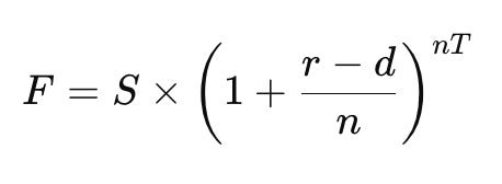 This is the discrete compounding futures pricing formula. Where F is futures price, S is spot price, r is annual risk free interest rate, d is the annual dividend yield, n is number of compounding periods per year, and T is time to expiry.