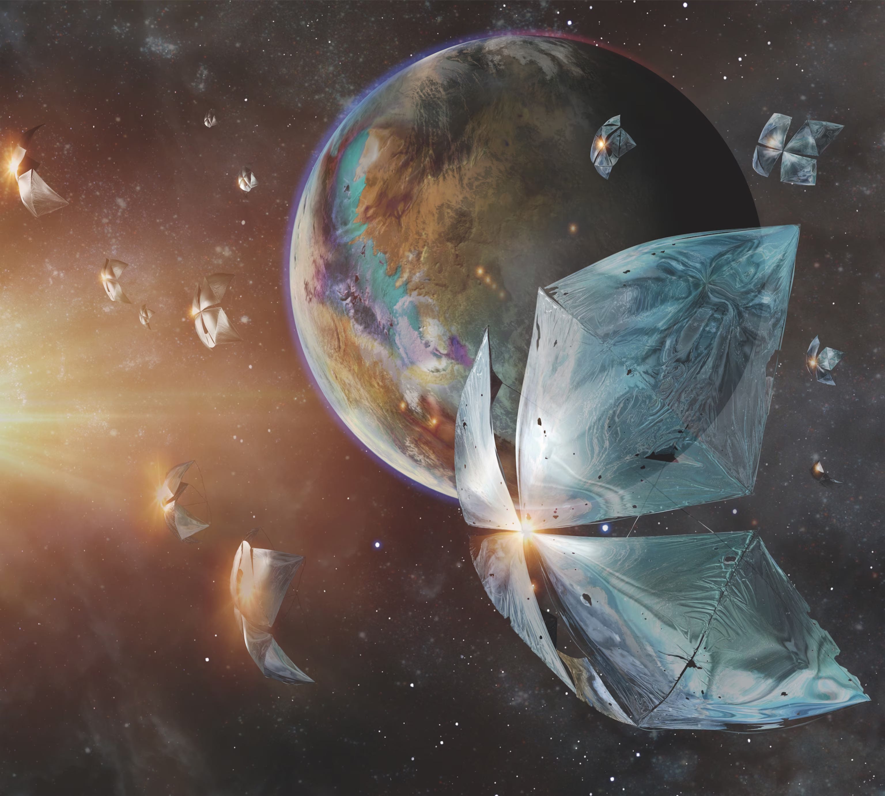 The modular design of the mirrors mean that the array doesn’t need to be finished before it can start gathering useful data: in principle, two mirrors separated by 100 km could already achieve a spatial resolution of about 200 km at the distance of Proxima Centauri (albeit the resulting image would be pretty sparsely sampled). There’s no particular reason the mirror swarm would need to stop at a paltry 20,000 units, either. You can keep adding to it indefinitely. If individual units get damaged, for instance due to getting hit by meteoroids, or if they just degrade beyond usability due to the accumulation of cometary dust on the mirrors, or if their thrusters run out of propellant, or their electronics irreparably damaged by cosmic rays and high-energy solar particles, they’re easily replaced.