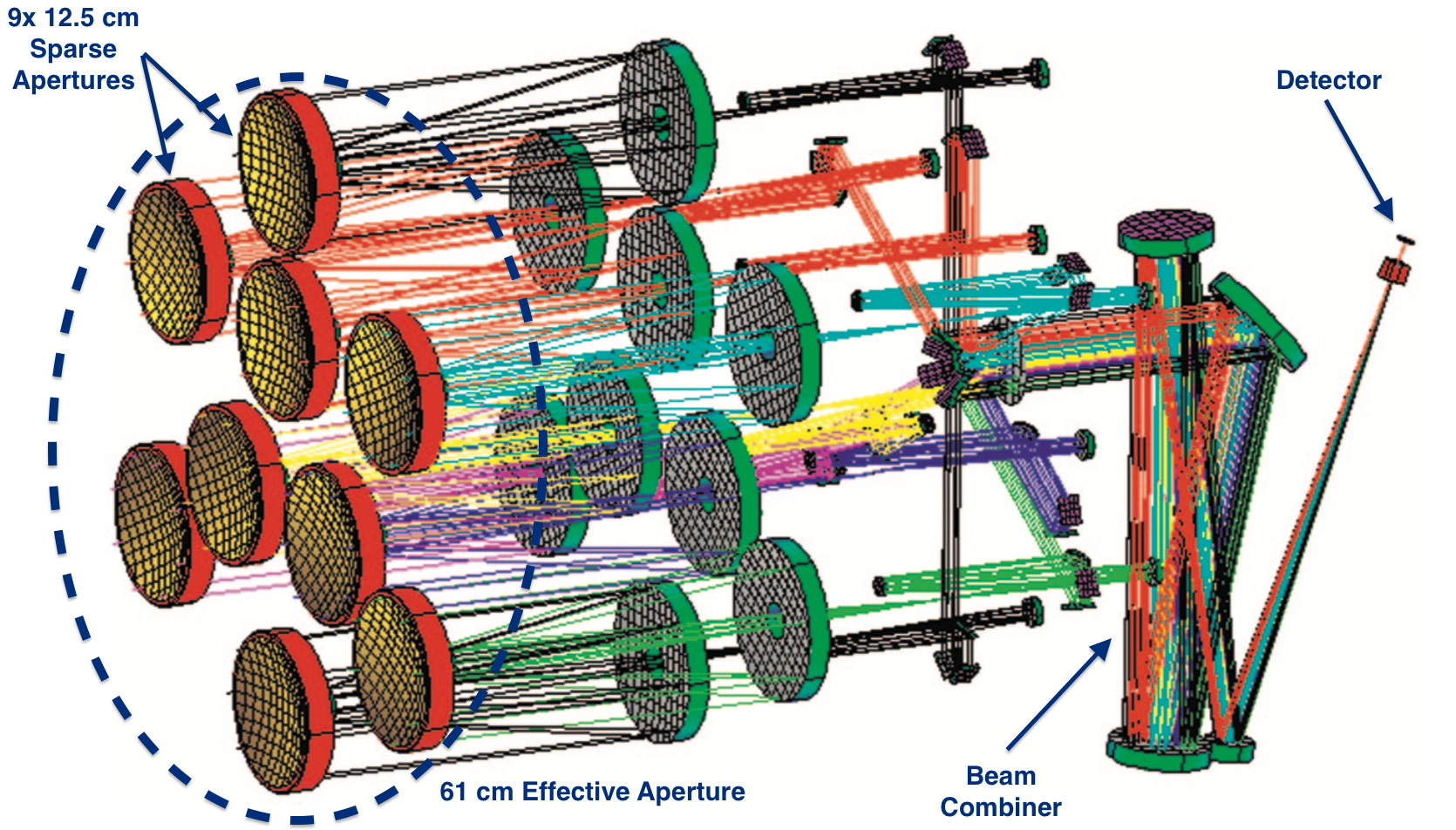 Interferometry is tricky stuff – as the word implies, it relies on careful measurement of interference patterns between light waves from different sources, which is an incredibly finicky process – so going this route introduces a significant degree of complexity. The technical term for this kind of space telescope is a sparse aperture space telescope, and this is not a new idea – there’s an MIT technology roadmap describing the challenges in developing the technology, and a laboratory version has been successfully tested by Lockheed-Martin.