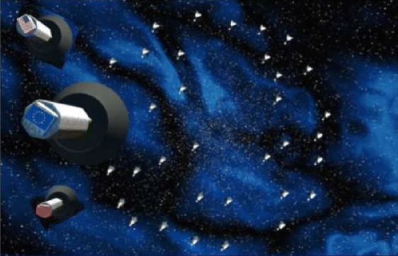 Recall that the Monster Telescope is assembled from tens of thousands of mirror segments, each of which begins its life as an independent spacecraft, with its own thrusters, attitude jets, electronics, communication antennae, and so on. Handmer indicates that they would manoeuvre to the assembly point and dock with adjacent segments, becoming part of one continuous structure ... but there’s no obvious reason that you’d want them to do that. The mirror segments could just as easily remain physically separate; indeed, this would probably greatly simplify functions such as pointing the array at different parts of the sky, since a swarm of independently moving spacecraft aren’t subjected to nearly the same level of structural strain as is one vast, flimsy structure assembled from tens of thousands of elements.