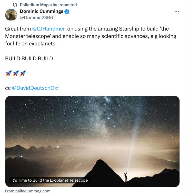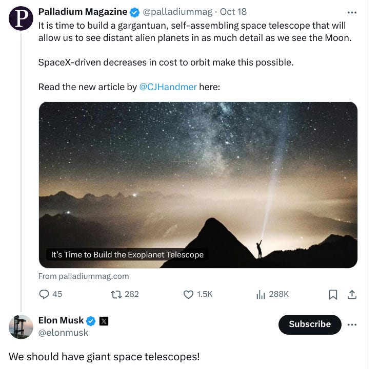 There’s another aspect of the Monster Telescope proposal that’s worth commenting on, which is how Handmer made the proposal in the first place. Such proposals are usually developed in scientific journals and presentations at conferences, and ultimately – after much laborious effort – turned into white papers which get submitted to national science agencies such as NASA or ESA in the hopes of convincing anonymous panels of reviewers to approve the tens of millions or tens of billions of dollars of funding that the project will require. By floating his idea in Palladium, a governance and technology publication with wide popular appeal, Handmer is bypassing the bureaucratic mechanisms of institutional science and generating interest directly in the general population (or at least the relatively intelligent, affluent, and open-minded tech bros and political dissidents who read Palladium, and who are also likely to care about space and space telescopes). Many academic scientists would no doubt consider this to be irresponsible cowboy behaviour.
