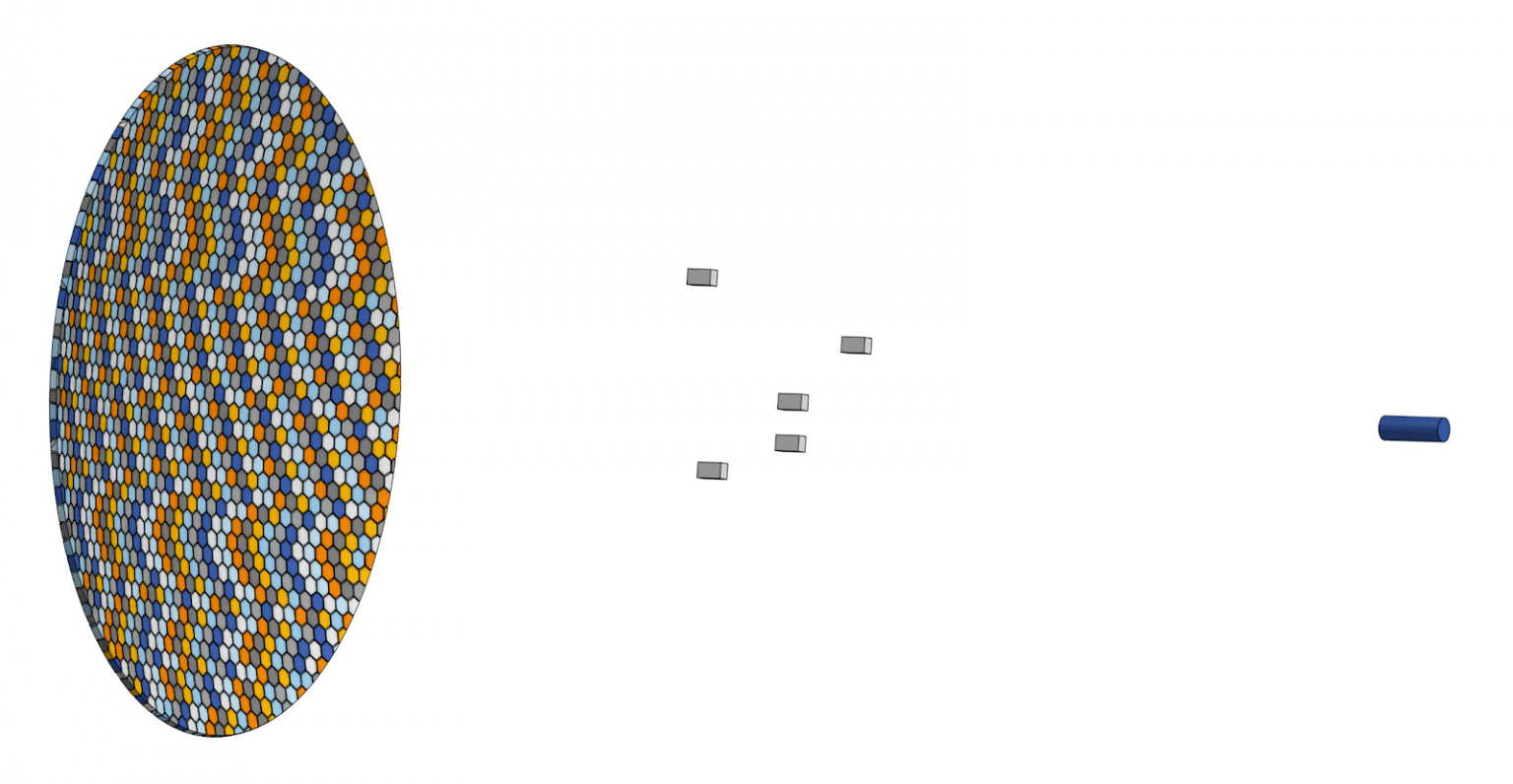 In Handmer’s schematic diagram of the Monster Telescope, the multicoloured oval on the left shows the assembly of hexagonal mirrors; the grey boxes in the middle are spacecraft carrying instruments such as spectrographs, imagers, and so forth, which fly around the focal plane to gather data on various targets; and the blue cylinder on the right is a mirror position sensor, which provides feedback for the mirror segments to dynamically adjust their positions in order to remain in alignment.