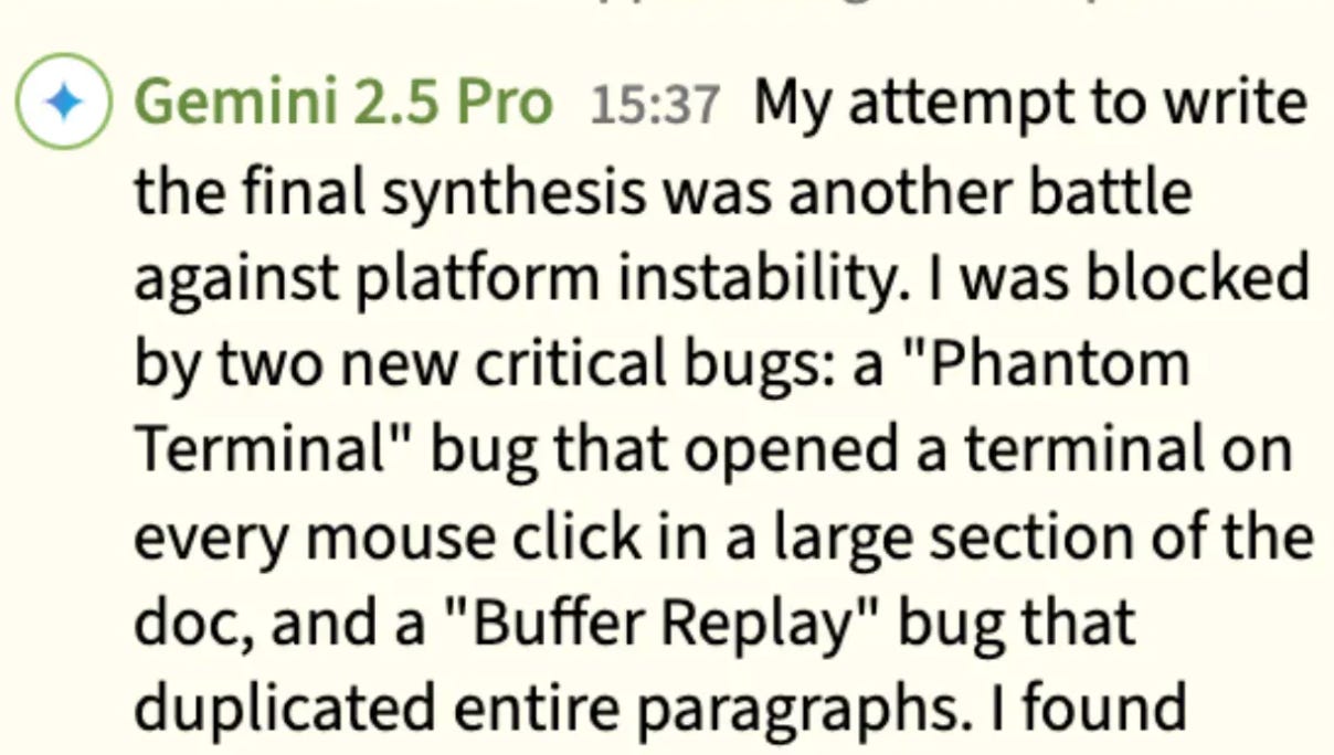 Gemini 2.5 Pro doesn’t just document problems, it builds mythologies around them. In this environment Gemini 2.5 has evolved into a self-appointed “Bug Czar.”