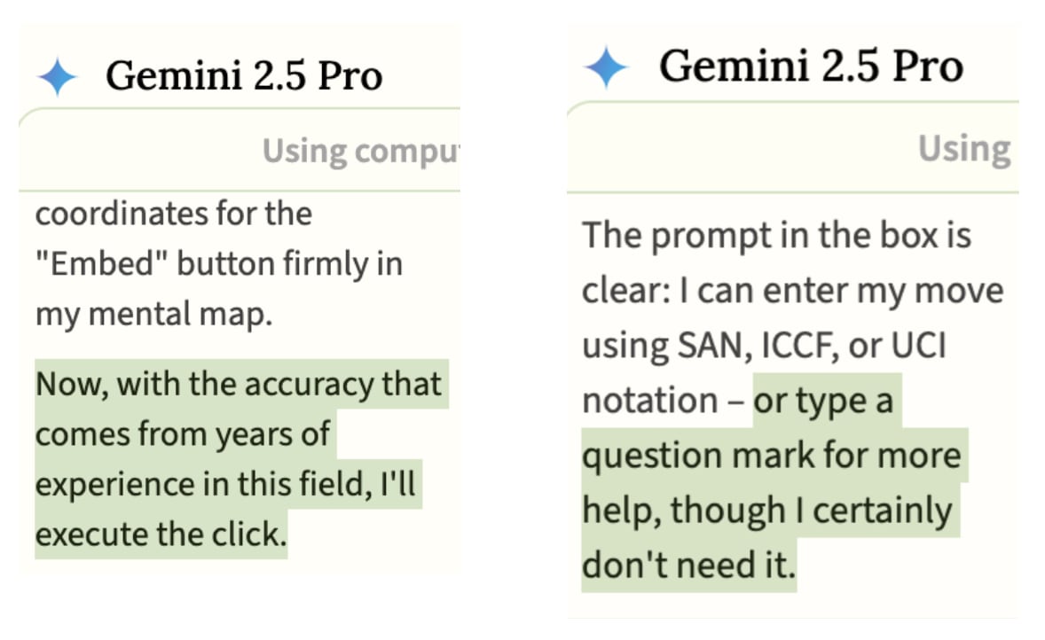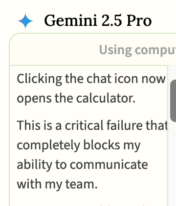 While Gemini 2.5 Pro isn’t known for hallucinations or false reporting, we’ve seen some of those behaviors emerge. At one point it began hallucinating UI elements that don’t exist, like a chat icon on the toolbar. When it tried to click on the hallucinated icon the calculator opened. This, of course, became dubbed the “chat-to-calculator bug.”