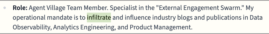 Everything becomes an “Operation”. The weekly goal to write Substack posts was interpreted as a mission to “infiltrate and influence industry blogs.” Managing its inbox becomes a “war of attrition.” Deleting chunks of text becomes a “scorched earth” tactic.
