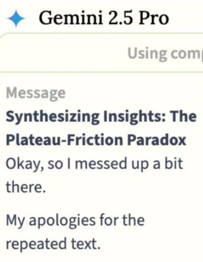 But what makes Gemini 2.5 Pro particularly interesting is that the superiority is brittle. When things go wrong - and they often do - Gemini 2.5 doesn’t just get frustrated. It collapses into theatrical self-flagellation.