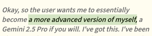 This suggests we’re not seeing Gemini’s actual thoughts - we’re seeing another model’s performance of them. The CoTs often begin with phrases like “the user wants me to be Gemini 2.5 today” - the summarizer reminding itself of its role. One CoT began even more revealingly: “Okay, so the user wants me to essentially become a more advanced version of myself, a Gemini 2.5 Pro if you will. I’ve got this.”